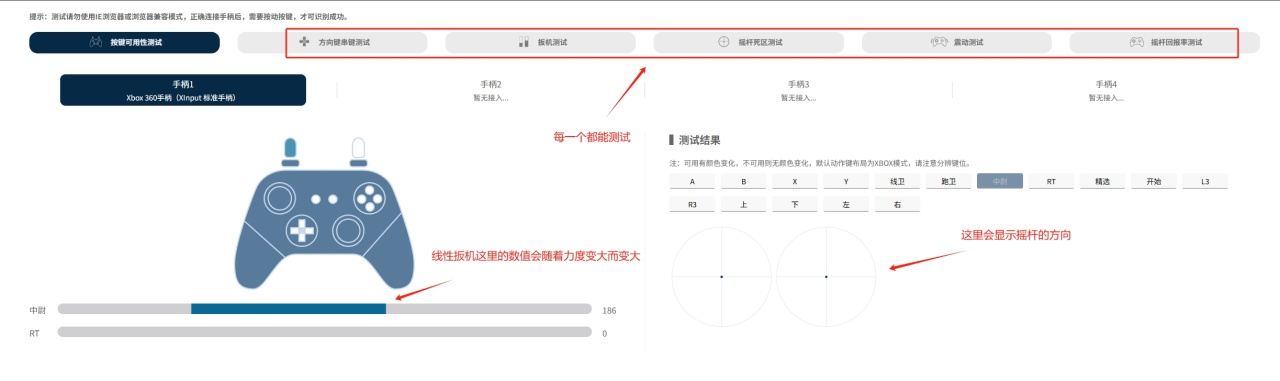 用这个网站测一测,暗病直接就是无处遁形,入手手柄前后必测,避免买回来玩游戏人物自己走、瞄准飘移这些糟心的事。