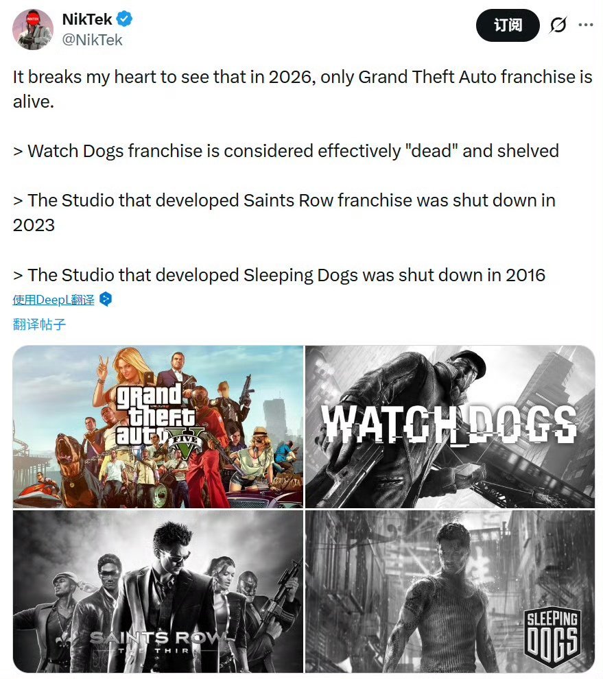 近日,推主NikTek的一句感慨戳中了全球玩家的心:“看到 2026 年只有《侠盗猎车手》系列还活着,我心都要碎了”