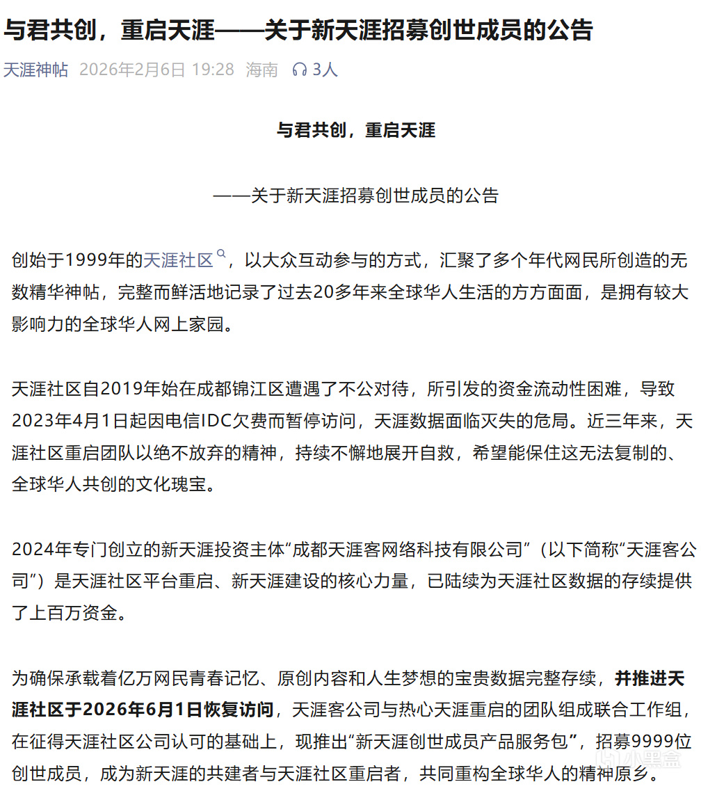 为确保承载着亿万网民青春记忆、原创内容和人生梦想的宝贵数据完整存续,并推进天涯社区于 2026 年 6 月 1 日恢复访问,天涯客公司与热心天涯重启的团队组成联合工作组,在征得天涯社区公司认可的基础上,现推出“新天涯创世成员产品服务包”,招募 9999 位创世成员,成为新天涯的共建者与天涯社区重启者,共同重构全球华人的精神原乡。