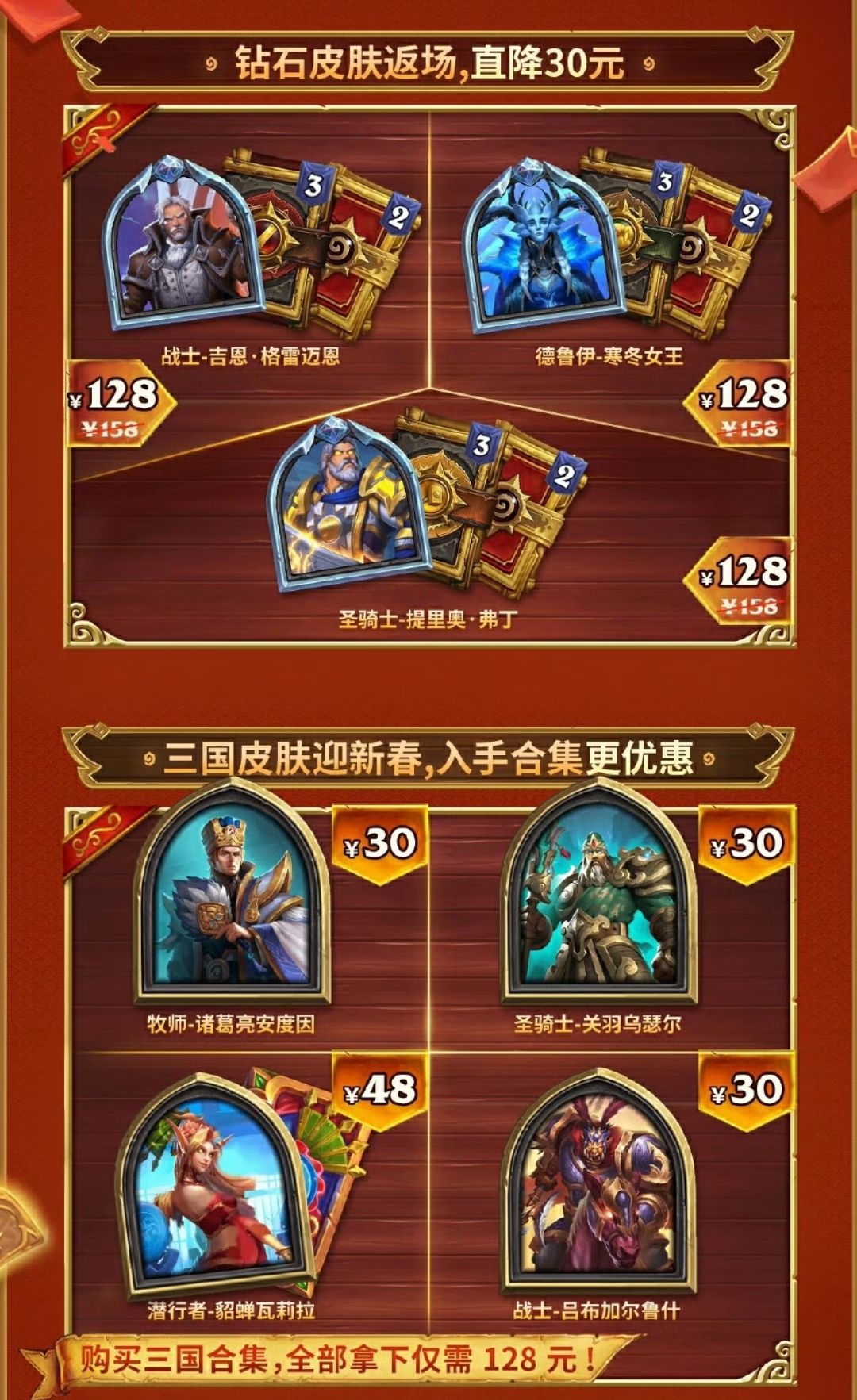诸葛亮、关羽、貂蝉、吕布等经典三国皮肤直降回归,钻石卡牌同步上架,更多精美皮肤低至6元起。