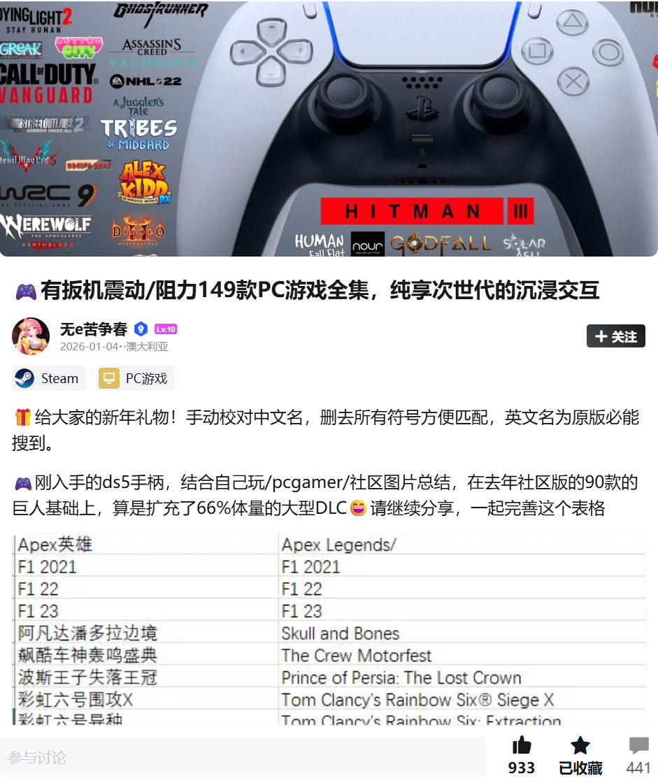 1.开始考虑买手柄,是希望体验一下键鼠没有的互动,尤其作为RPG玩家,更添一份沉浸。恰逢ds5打折只要330,果断拿下“次世代”手柄巅峰,御三家索任微周边也是玩上了。跟着这个盒友的清单爽了好久🎮有扳机震动/阻力149款PC游戏全集,纯享次世代的沉浸交互 (已取得作者引用授权)