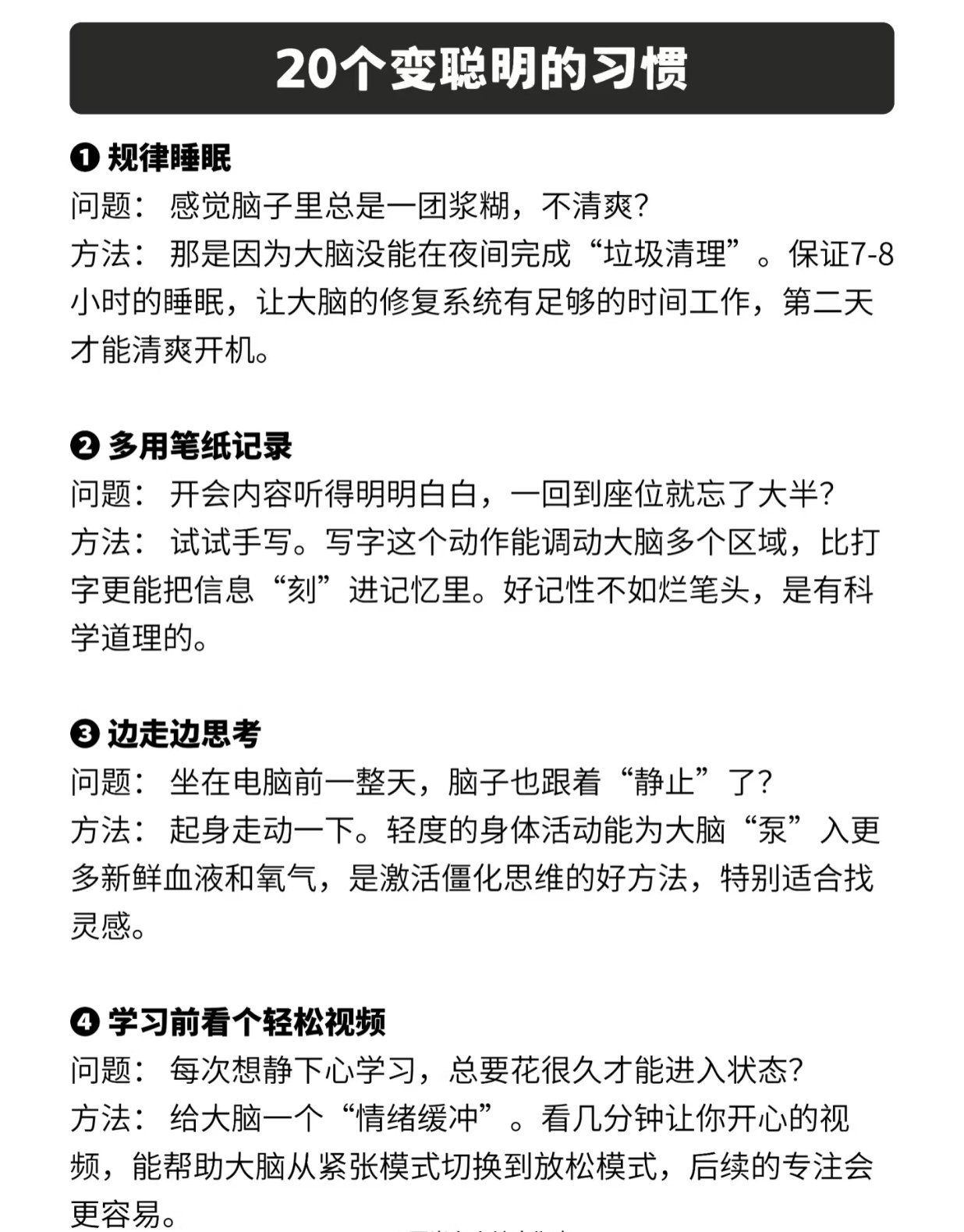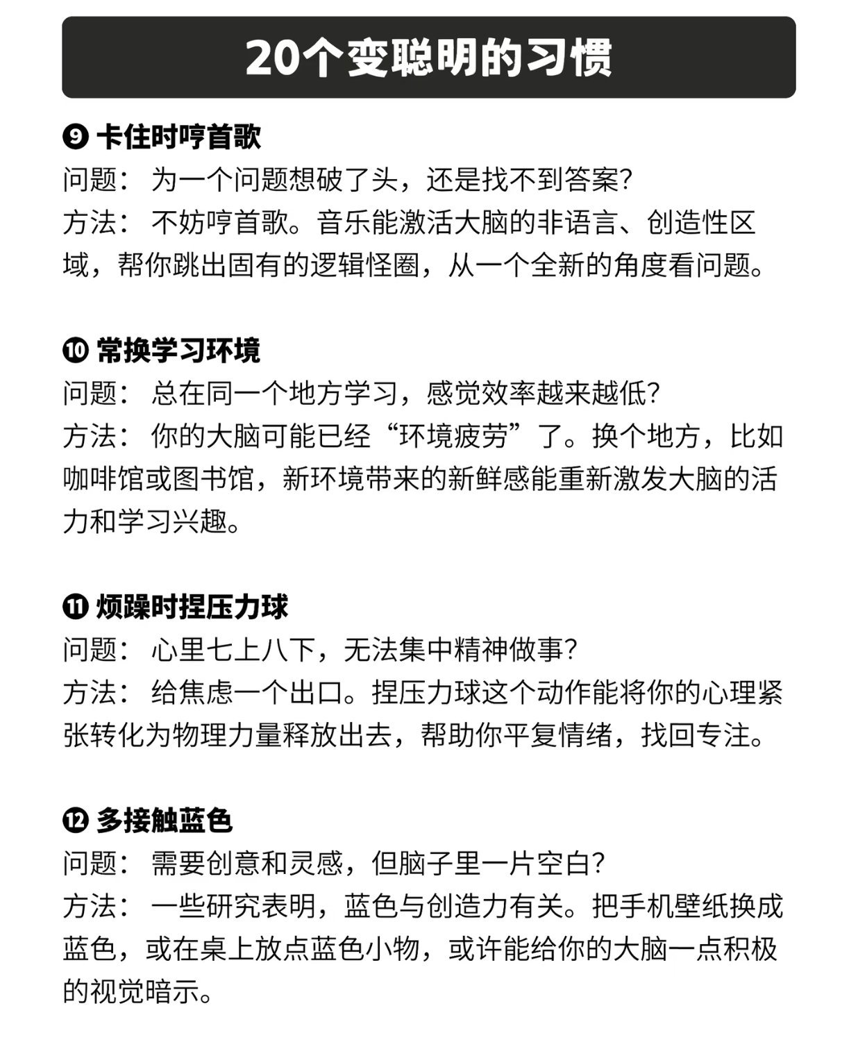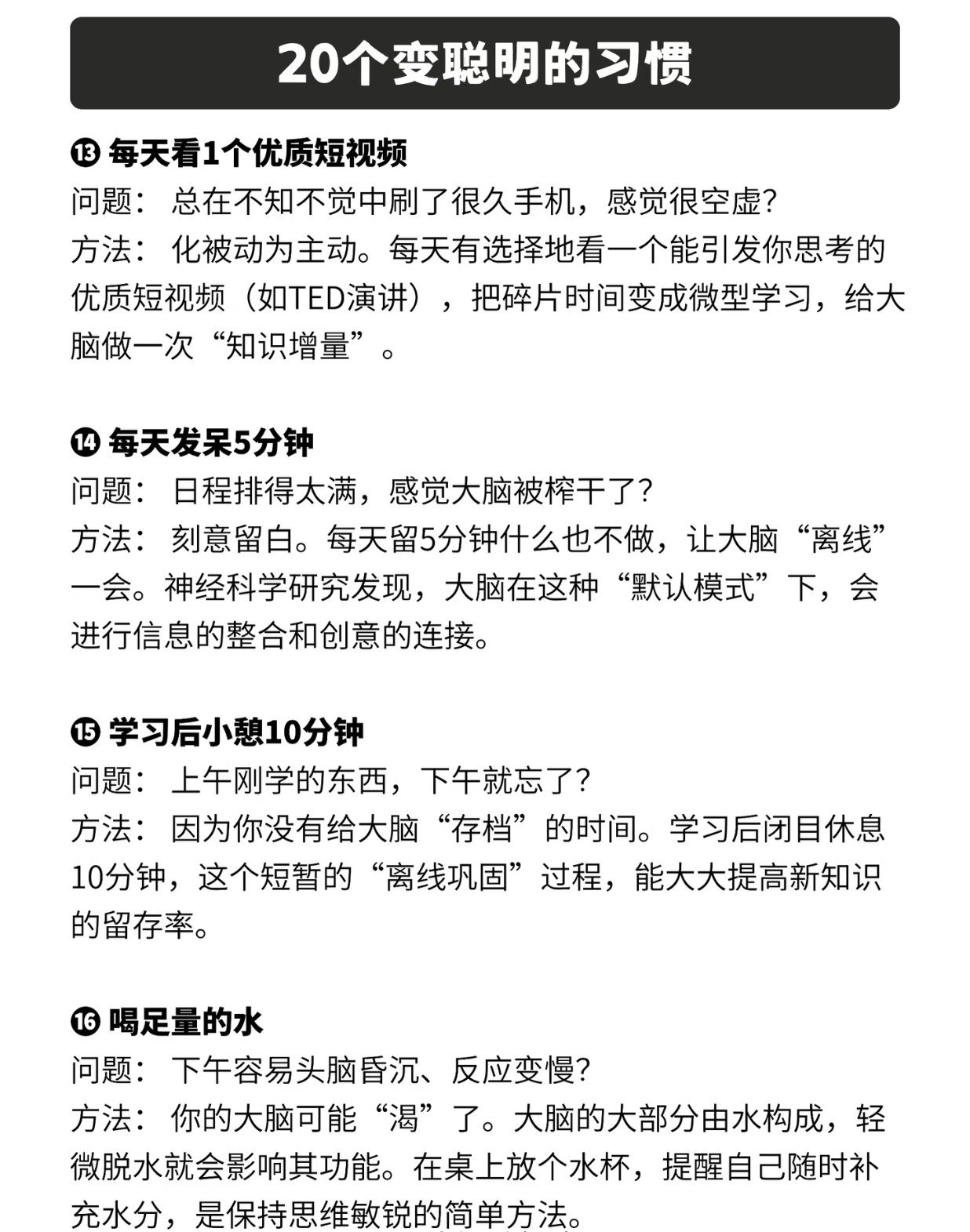 方法:刻意留白。每天留5分钟什么也不做,让大脑"离线"一会。神经科学研究发现,大脑在这种"默认模式"下,会进行信息的整合和创意的连接。