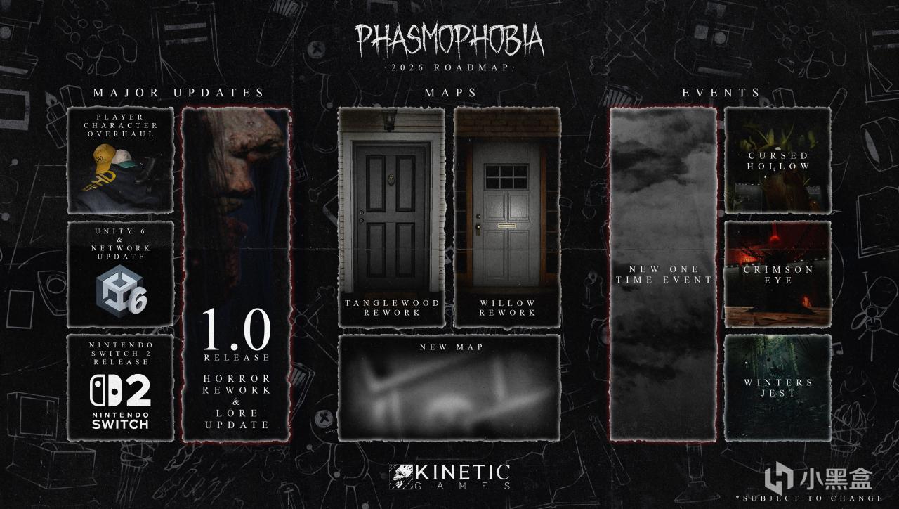 正如路线图所示,我们在 2026 年准备了多项重大更新:包括玩家角色更新、将《恐鬼症》迁移至 Unity 6 引擎、网络代码更新、在 Nintendo Switch 2 平台发布,以及最重要的 恐鬼症 1.0 版本——它将带来恐怖元素重做、背景故事更新等更多内容。