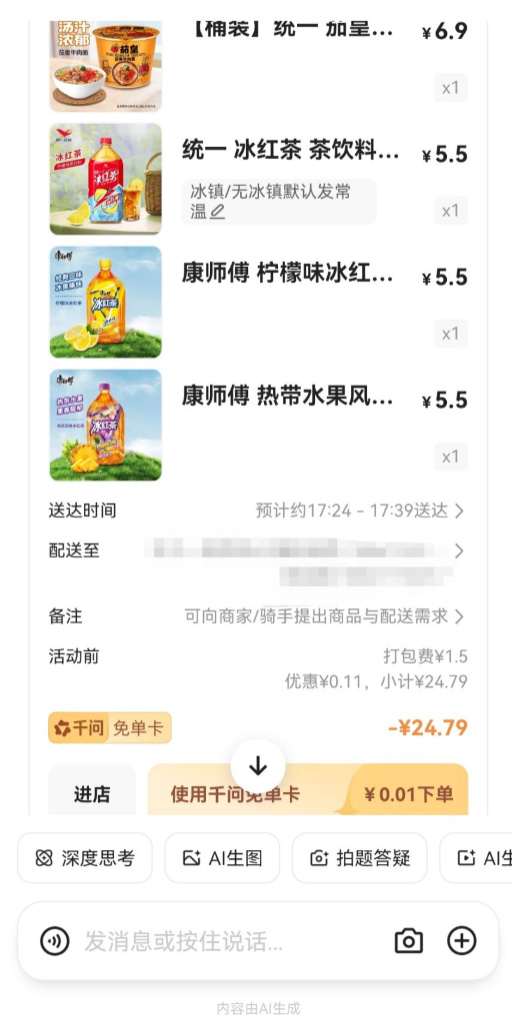 然後我就被千問給埋伏了,下午消息根本發送不出去,等消息發出去的時候已經是晚上0點了,但我0點還喝個錘子奶茶啊!?