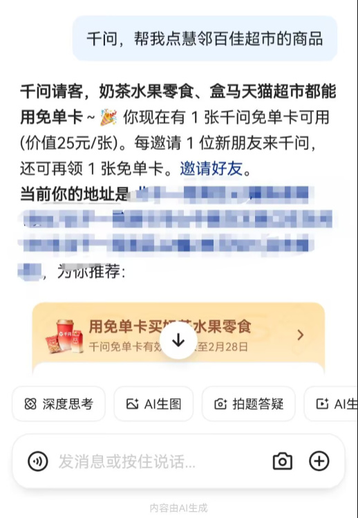 沒想到還真能行,方法也很簡單,先去淘寶閃購找你要買的東西的店名,然後把奶茶換成店名,千問就能幫你自動找到附近的商家,然後你就可以美美下單了。