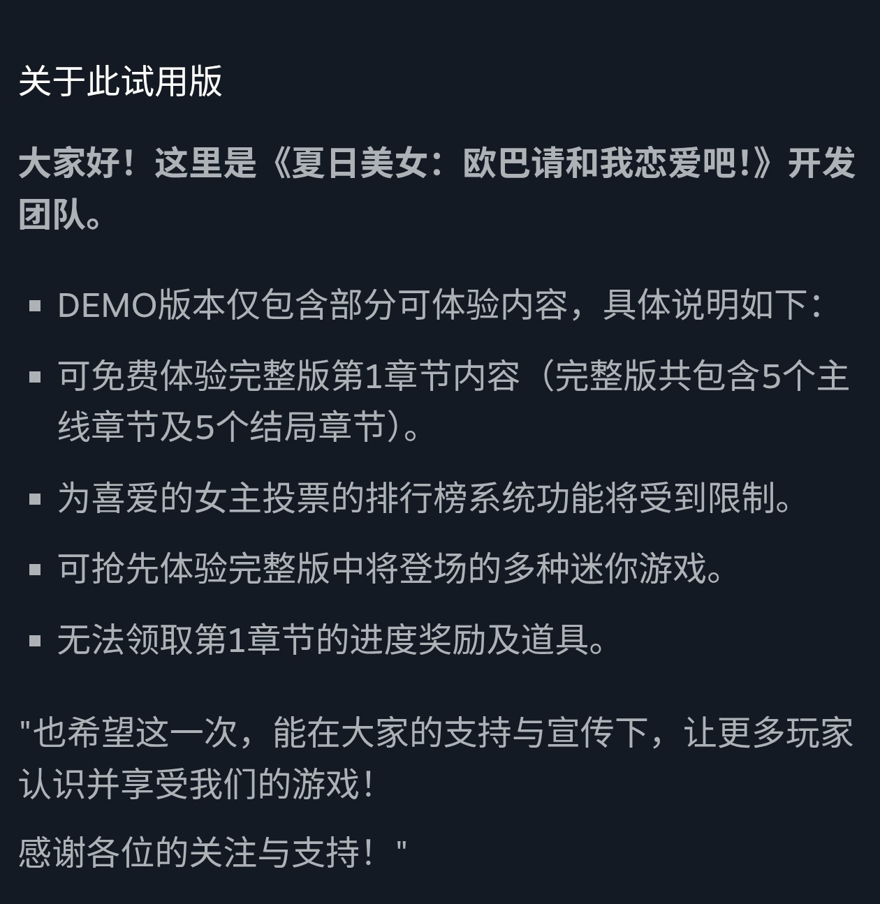 《夏日美女:欧巴请和我恋爱吧!》demo预计2月9早上上线,demo包含完整版第一章的全部内容,而完整版一共包含5个主线章节及5个结局章节。(详情见下图)