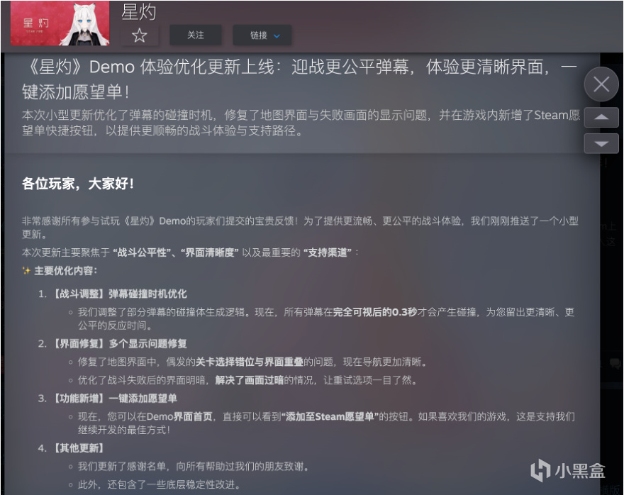 基于所有这些问题和建议,我们已经完成了一轮紧急更新。所有已知的体验问题都已修复,相关的公告已经在Steam社区发布。《星灼》的世界,正因为你们每一次认真的审视,而变得更好,也诚挚邀请你来玩一下我的游戏并提出你的真实反馈。有很多人反馈说我的游戏普通难度比较难,也有说那个简单难度太简单了。哈哈,如果大家都是这样的感受那我后续会认真考虑调整难度分布。