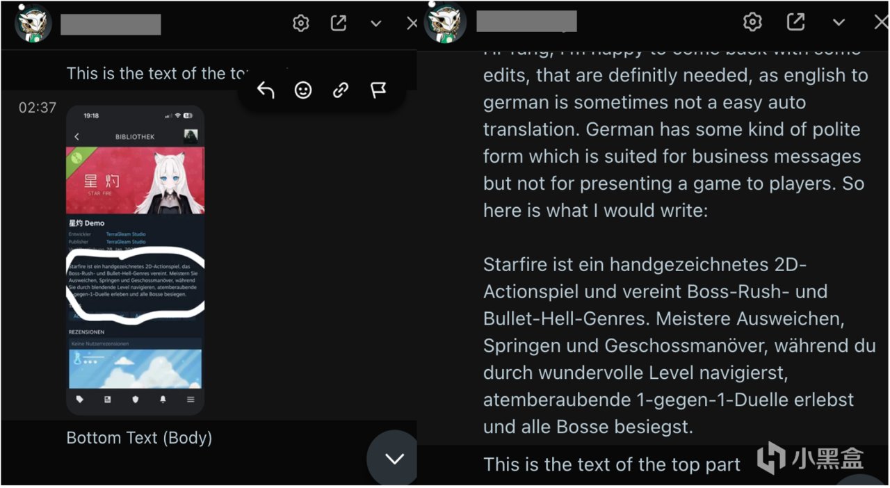 我要感谢所有在试玩后提出“UI重叠了”、“选项框太暗了”这些具体问题的朋友,是你们让我的游戏变得更好。另外,我还要郑重感谢一位来自奥地利的朋友,他试玩以后为我提供了专业又地道的德语翻译修正,说实话真的是意外的惊喜啊,这份来自远方的善意和温暖真的让我无比感动。