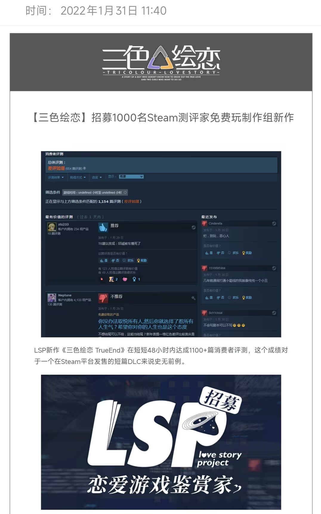在排山倒海的差评狂潮之后,LSP给每个玩家贴脸发了一封嘲讽邮件,庆祝这个DLC在steam上前无古人后无来者的成就。