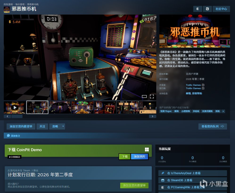 这款游戏名叫《邪恶推币机》,听名字就很邪恶,结合了肉鸽元素和推币机元素,计划发行日期显示为2026年第二季度,不过Demo已经推出了。