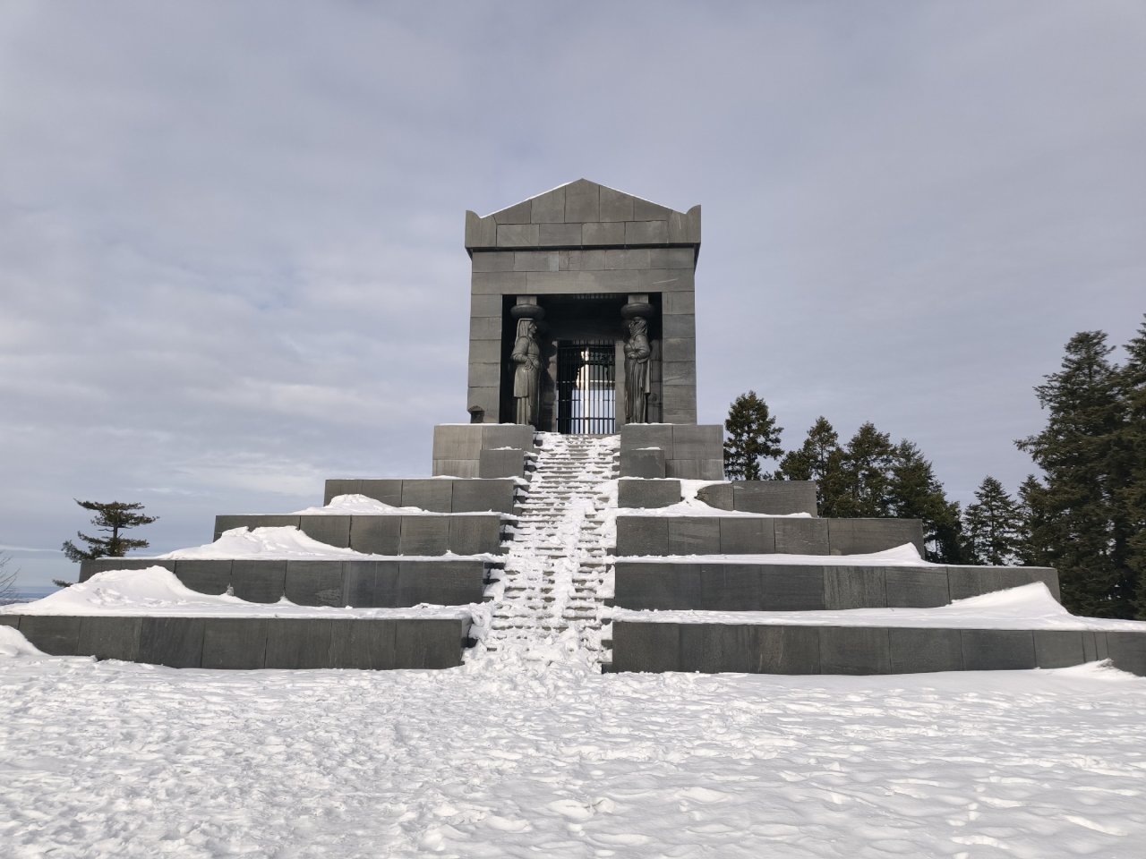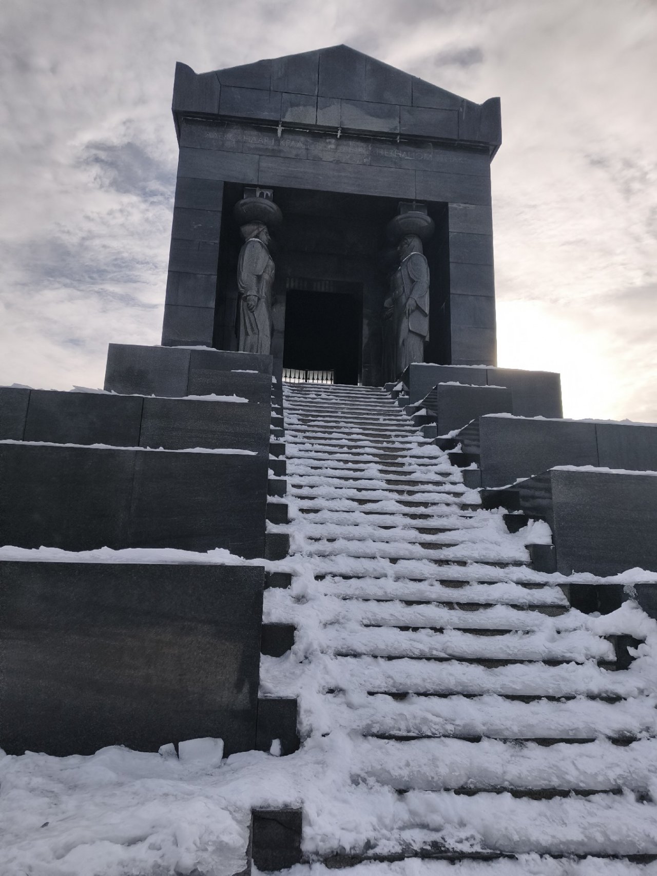 缓慢上行一个半小时后终于到达了山顶。首先是无名烈士纪念碑(Spomenik Neznanom Junaku),该纪念碑建于1938年,是为了纪念死于一战的塞尔维亚士兵。可以说南斯拉夫王国的领土正是在一战前后发生的一系列巴尔干地区战争所奠定的。建筑本身与其说纪念碑,更类似于神庙和棺椁,里面伫立着象征八位斯拉夫母亲的雕像。