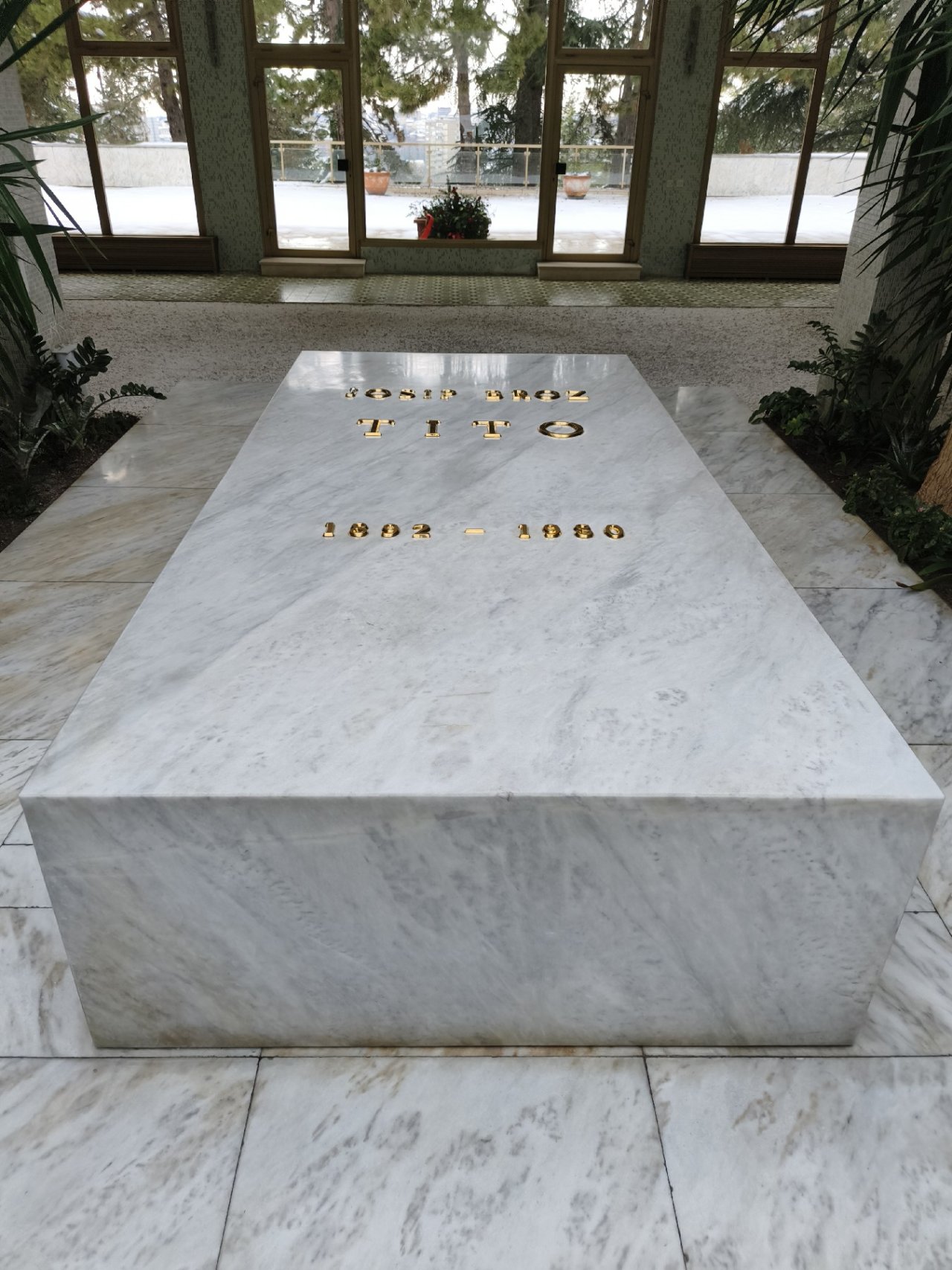 铁托生前酷爱养花,所以死后就将他在安葬在“花屋”之中。他的坟墓由一块白色的方形大理石设计而成,而在他的墓的周围则是一个关于他的小型展览区。门口有一个留言簿,翻来翻去基本就是对铁托和南斯拉夫和不结盟运动的赞美,我留了“敢同恶鬼争高下,不向霸王让寸分”。