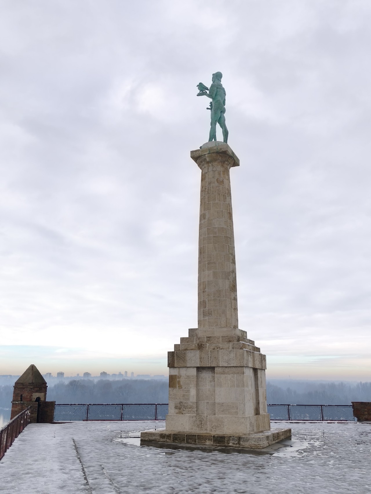 对岸就是贝尔格莱德要塞。从地势就可以猜到这里是兵家必争之地,从罗马时期就开始修建要塞了,而最近一次修建是奥斯曼控制时期。要塞分为上城、下城和卡莱梅格丹公园。上城是核心防御区,视野开阔,能俯瞰两河交汇;下城曾有港口、教堂与军营。上到最高处,贝尔格莱德一览无余,而旁边这是纪念巴尔干战争的“胜利者(Pobednik)”雕像。