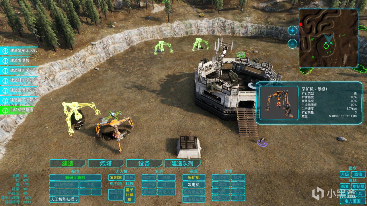 先来说说塔防建造和RTS部分,玩家初期需要通过无人机建造采矿机,进行采集并管理三种资源:金属矿、铀矿、钍矿,每种资源直接影响炮塔建造、弹药补给与科技研发等。除了矿产资源外还有能量,需要通过建造发电机获得。有点小时候玩的《红警》那味道。
