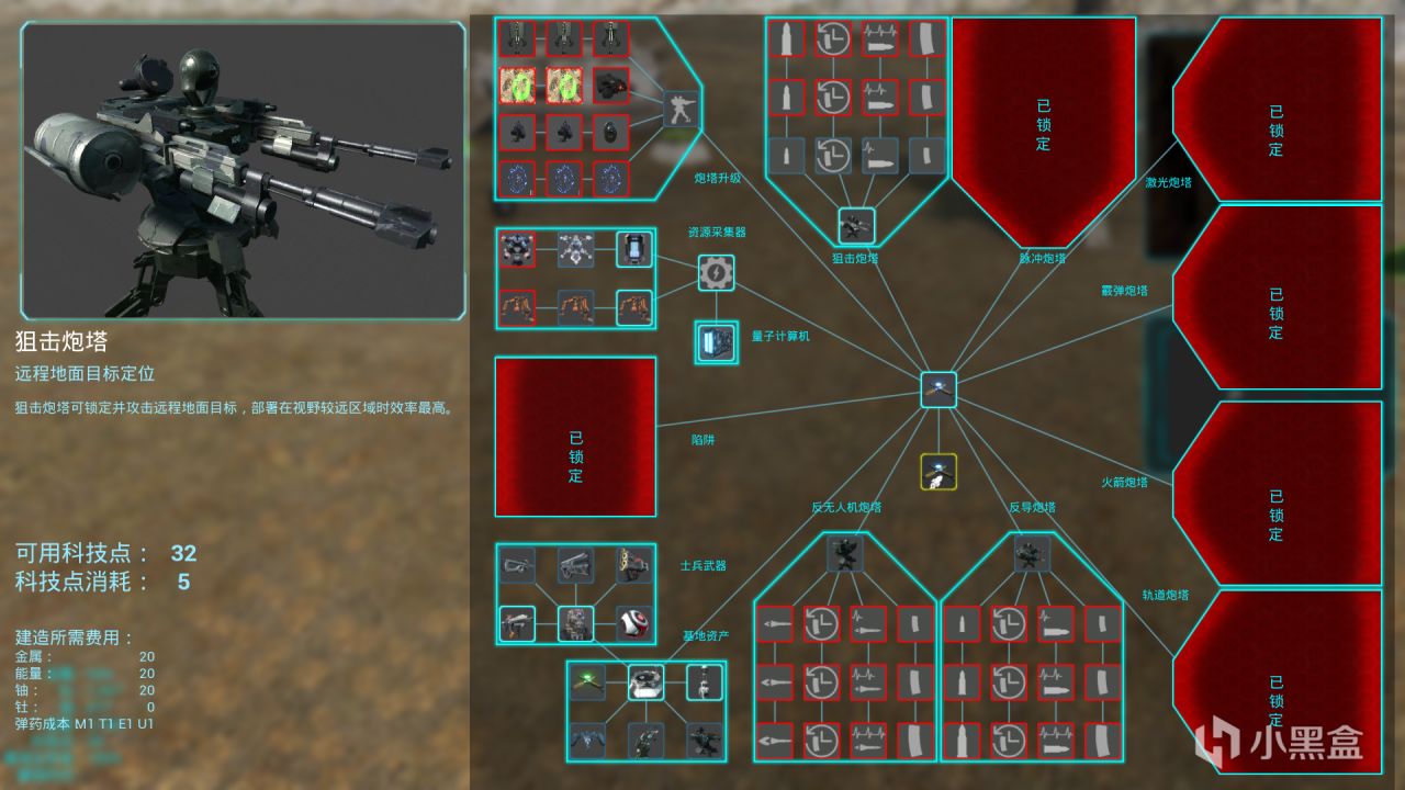 另外还有一个至关重要的资源就是:科技点。可以通过建造量子计算机来获得,用来解锁和升级炮塔、建筑、枪械等高端战备。游戏内光炮塔就有八大类型,如激光塔、电磁炮、防空导弹等丰富多样。科技树系统提供了深度化的战术选择,比如敌方的空中单位来袭时,是优先建造反无人机炮塔和反导炮塔,还是快速切换成第一人称视角进行手动拦截,都是玩家需要去思考去调整策略的。