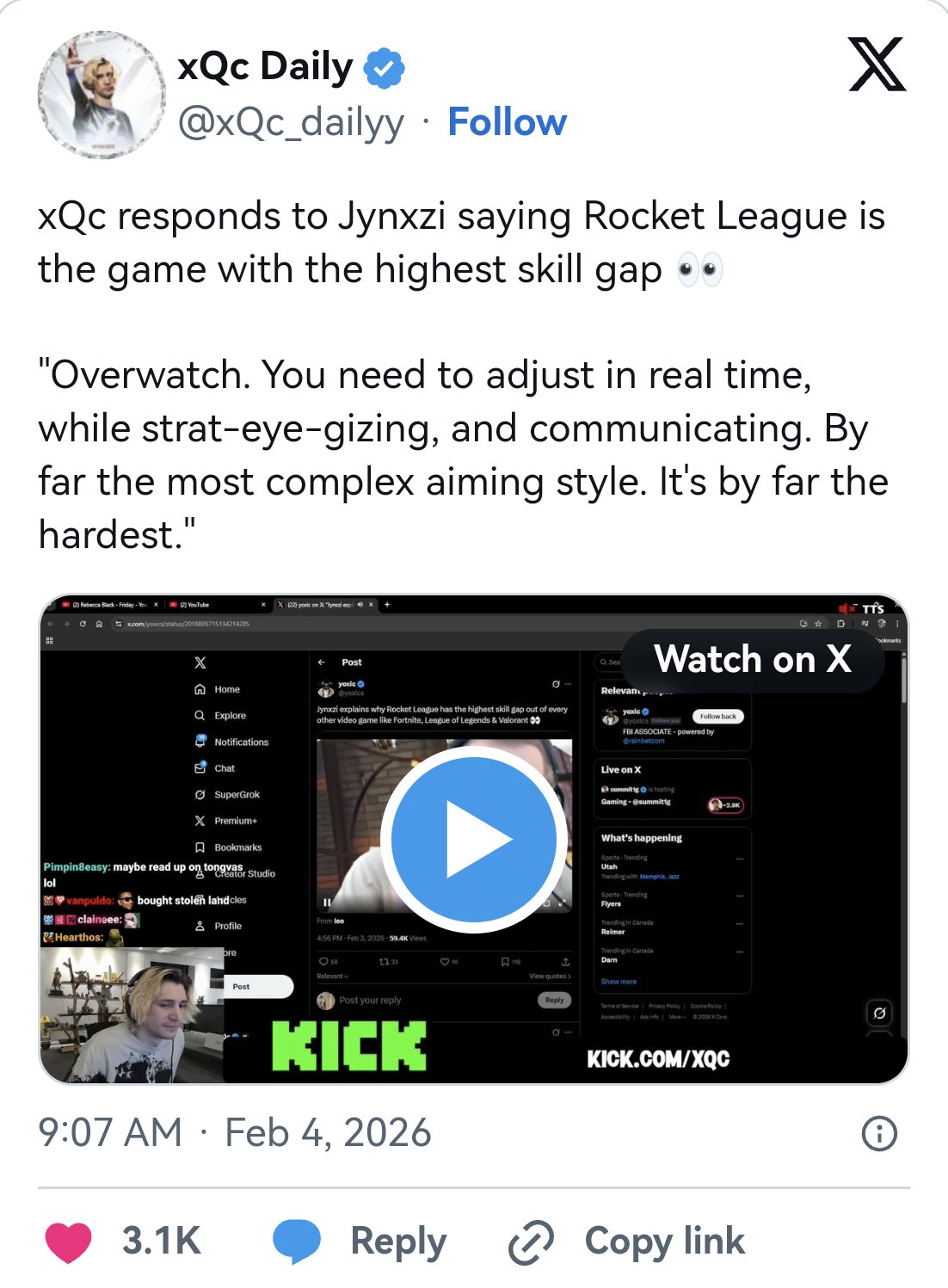 对此,前《守望先锋》职业选手、人气主播xQc提出了明确反对:他认为《守望先锋》才是难度最高的游戏