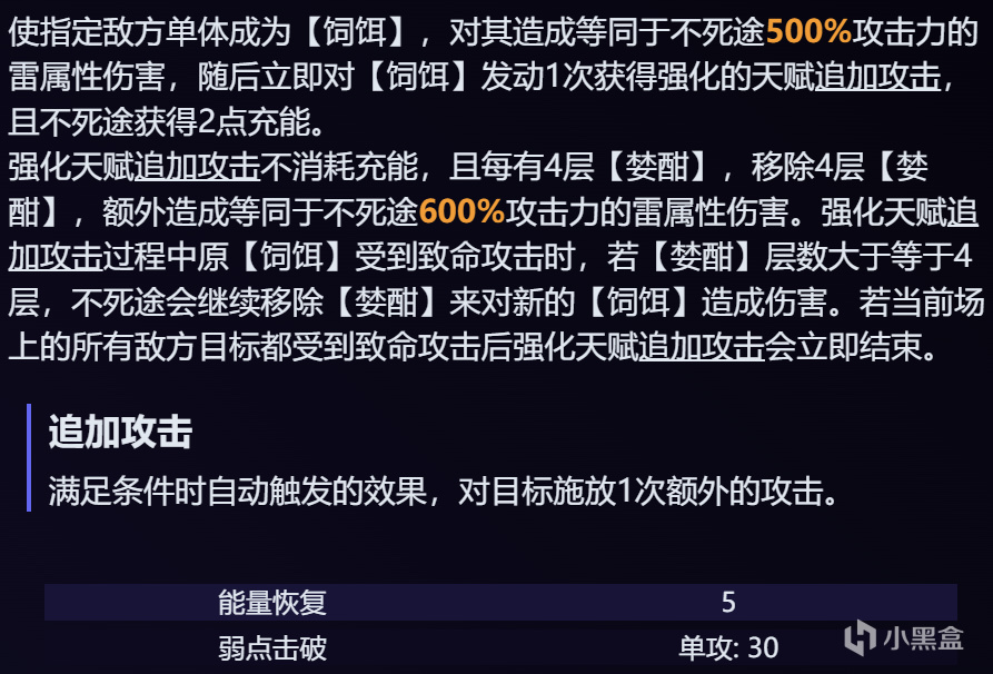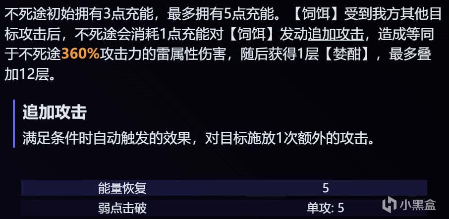 影肢:我方目标每次施放追加攻击时,使该次追加攻击造成的伤害提高80%,若是不死途施放追加攻击,额外使不死途固定恢复3点能量。