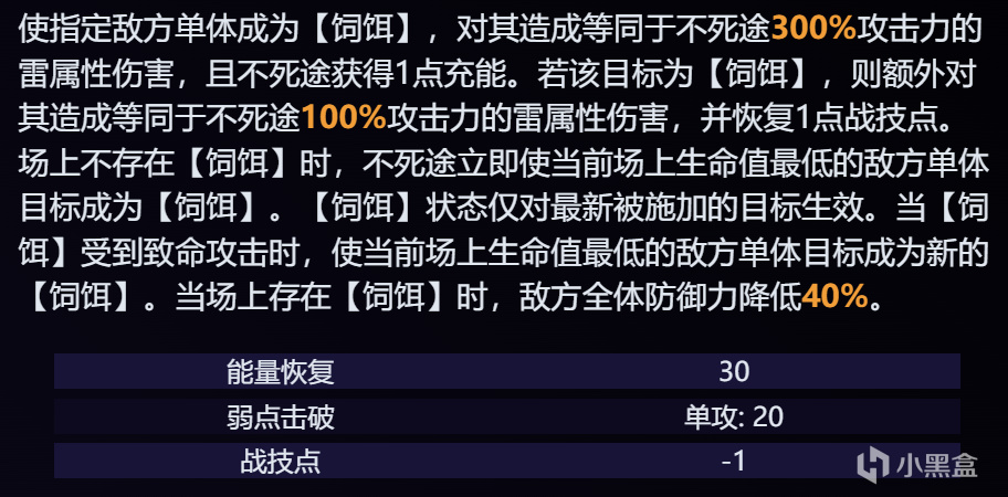 不死途施放终结技时,攻击力提高40%,持续3回合。