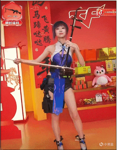 最开始,女团角色“虹儿”的Coser入场,游戏里作为二胡少女的她,在直播间也用二胡弹奏了一首新春序曲。当熟悉的旋律响起,刻在中国人记忆里的年味儿便弥漫开来了,这种开场一度让我产生了误入“二游新春会”的错觉。