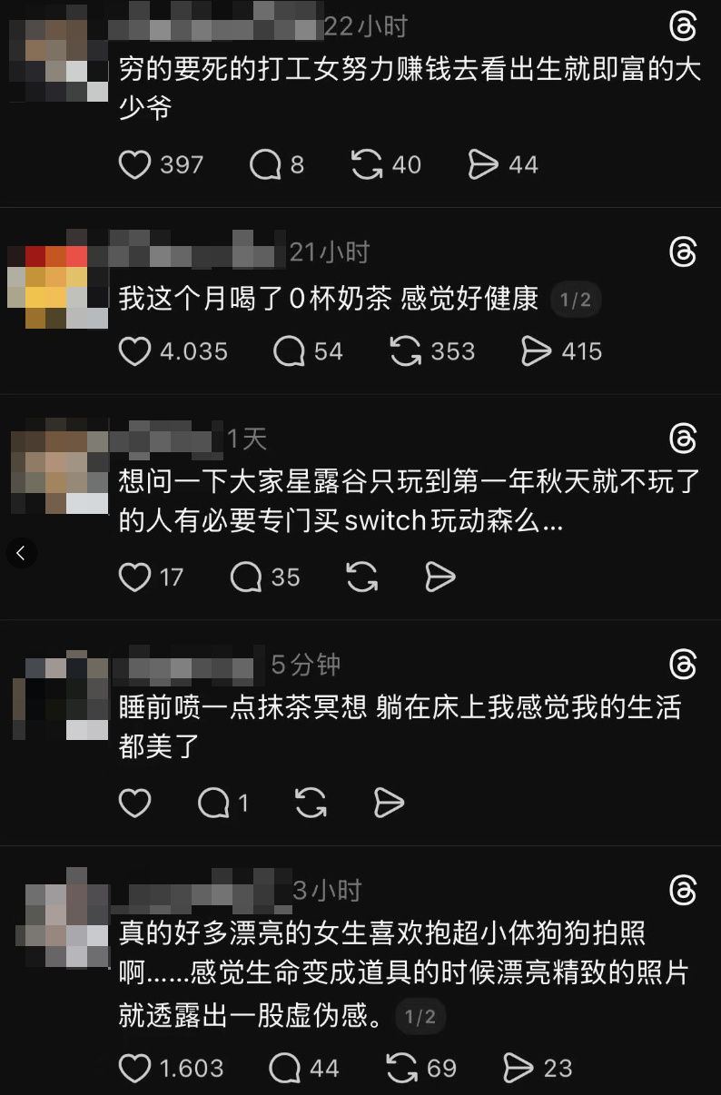 內容上給人的感覺也跟 X 不太一樣,這裏沒有什麼大新聞,也沒那麼多懂王在指點江山。滿屏都是一些碎碎念, 關於自己的生活、對事物的看法,又或者是一些能引起討論的話題。