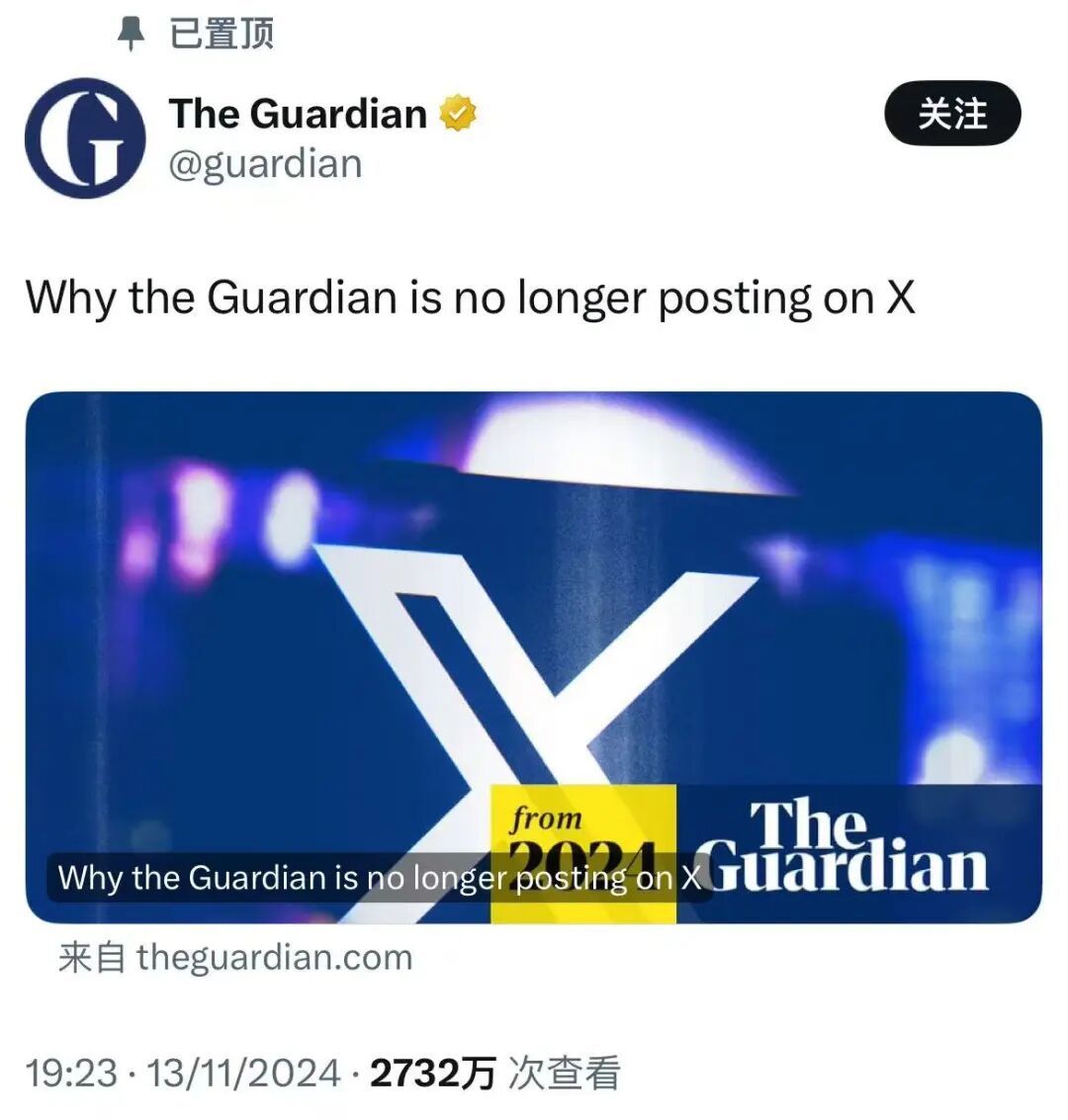 早在 2024 年,英國著名的媒體《衛報》就宣佈,不會在 X 上發帖了。