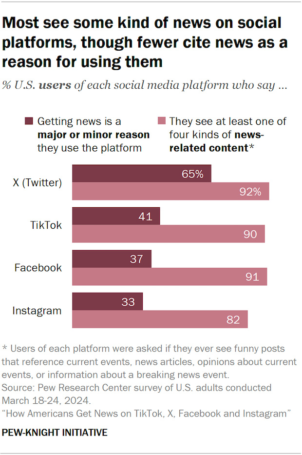根據皮尤研究所的一份報告,大多數 X 用戶表示,獲取新聞資訊是他們使用該平臺的主要或次要原因,約有一半的用戶表示,他們經常在 X 上獲取新聞。