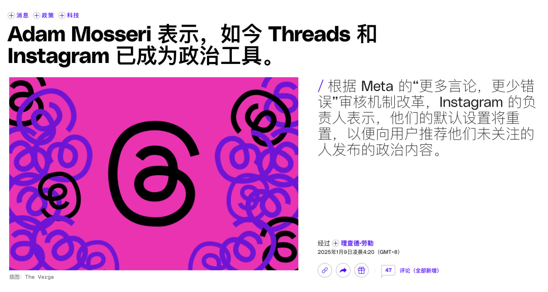 根據外媒報道,Instagram 的一把手 Adam Mosseri 在 Threads 上線之初就攤牌過,他們的目標是打造一個“更少憤怒的對話場所”,不鼓勵政治或者硬新聞內容。