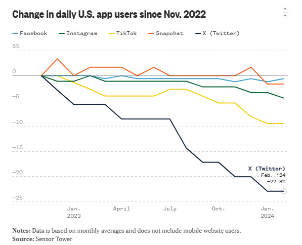 被馬斯克收購之後的一年多時間裏, X 在美國的每日活躍用戶數量下降了 23% ,幾乎斷崖式下跌的日活,是幾家平臺裏面跌得最狠的。(數據截至 2024 年 2 月)