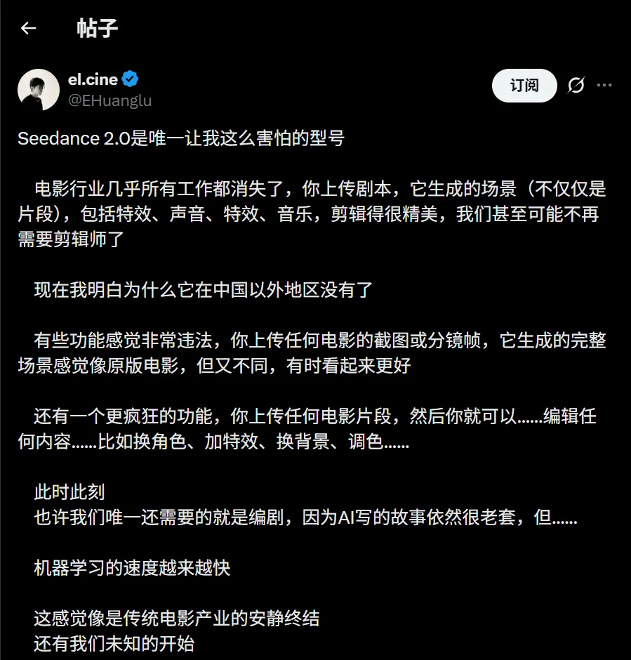 海外 AI 博主 @EHuanglu 直接表示恐惧。