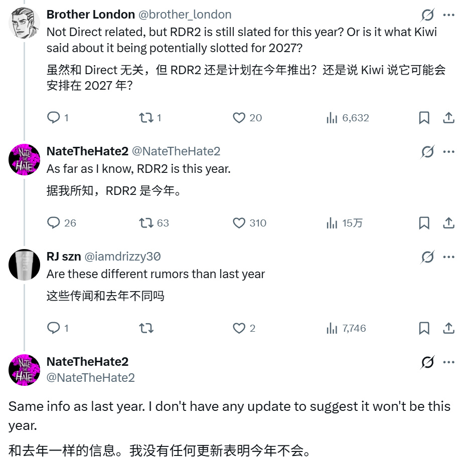 知名爆料人NateTheHate去年就曾宣稱《荒野大鏢客2》的增強版仍在開發中。雖然當時未提及發售窗口,但他在最新推文中表示:"據我所知,《荒野大鏢客2》會在今年推出。"當被問及此傳聞是否與去年不同時,他回應道:"和去年信息一致,目前沒有跡象表明今年不會發售。"