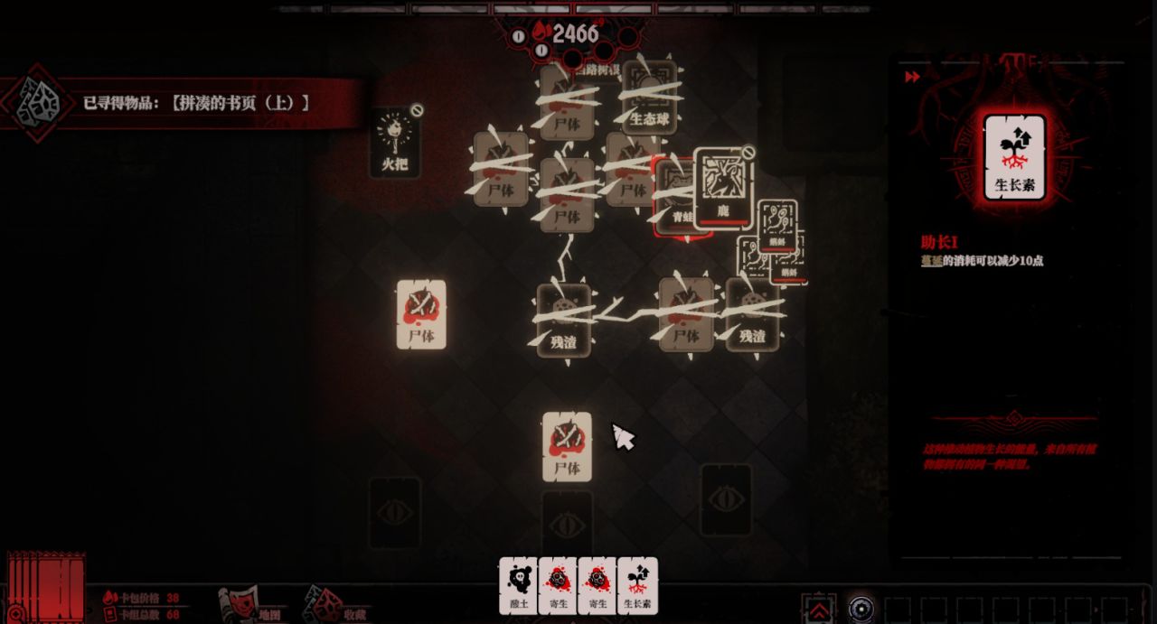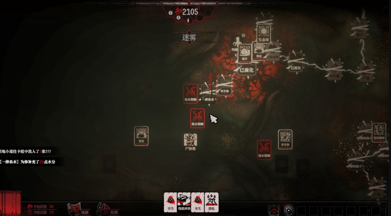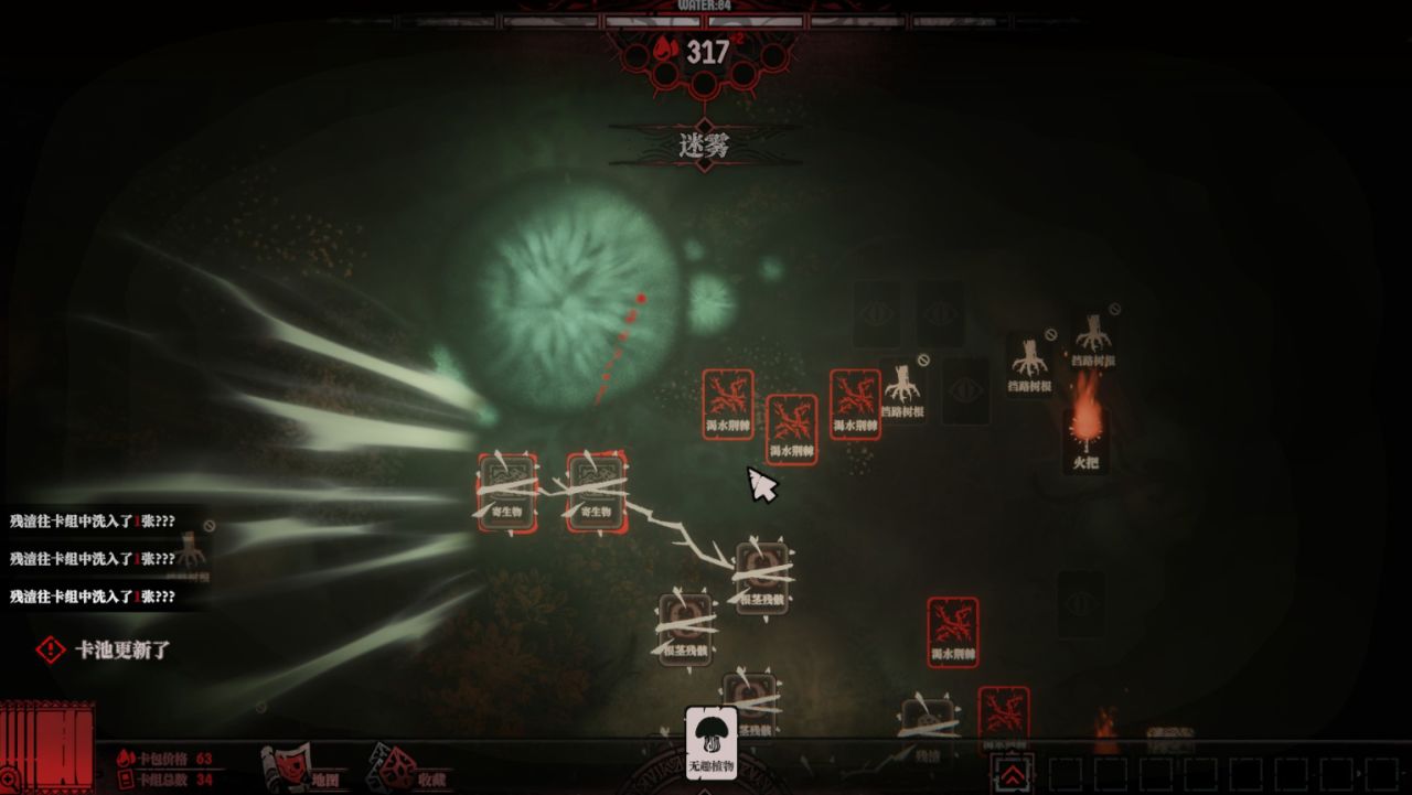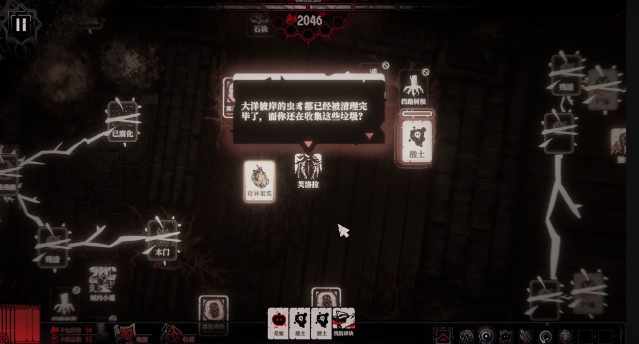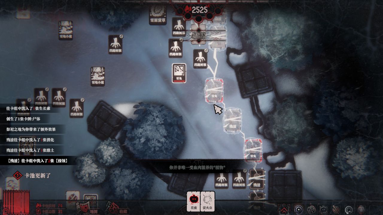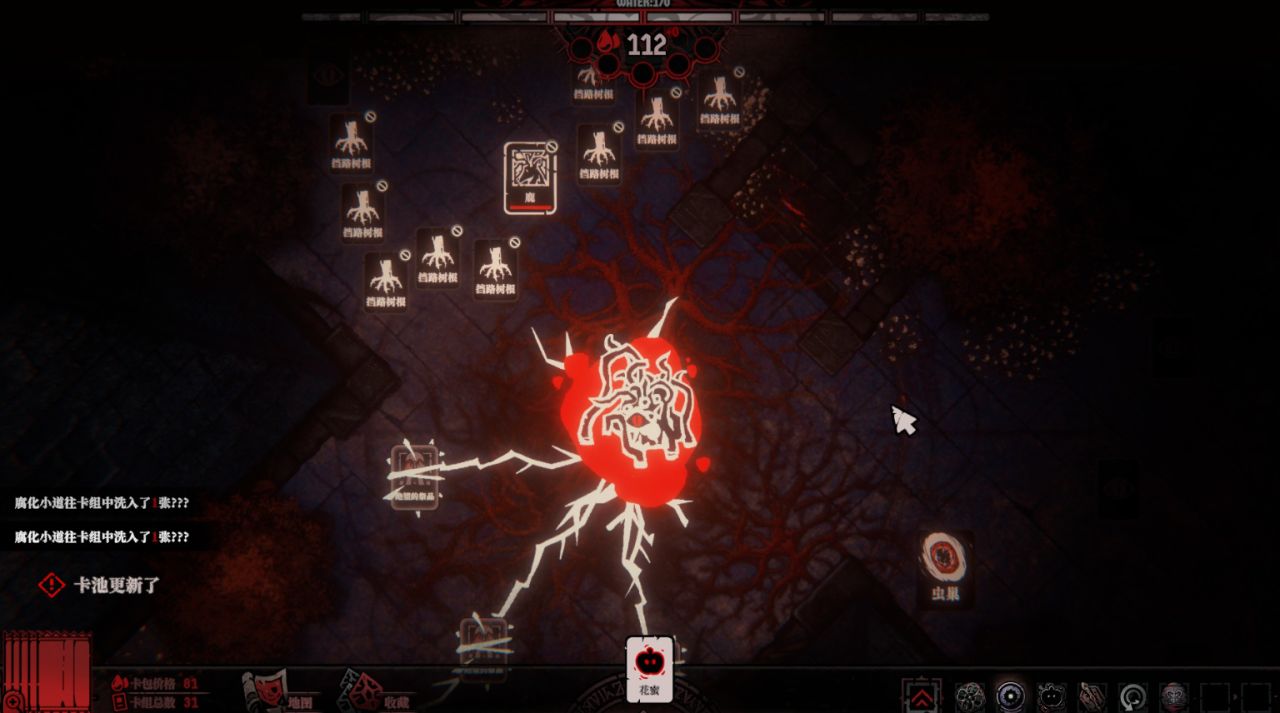因为在你找到人类之前,为了继续前行,你只能将根须连接一些臭老鼠、腐烂的肉块、尸体、寄生物和残渣等,把这些价值不高的卡牌当作前进的垫脚石。