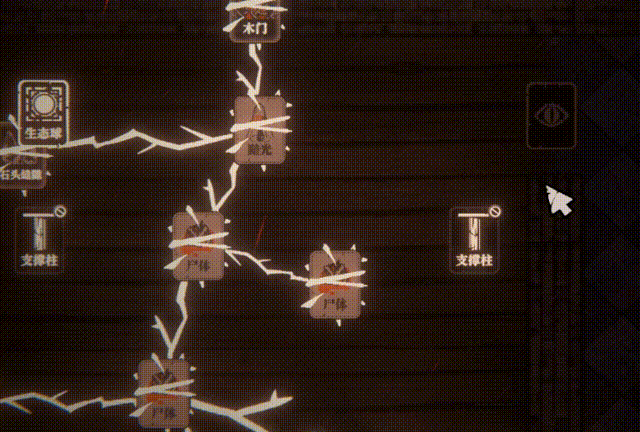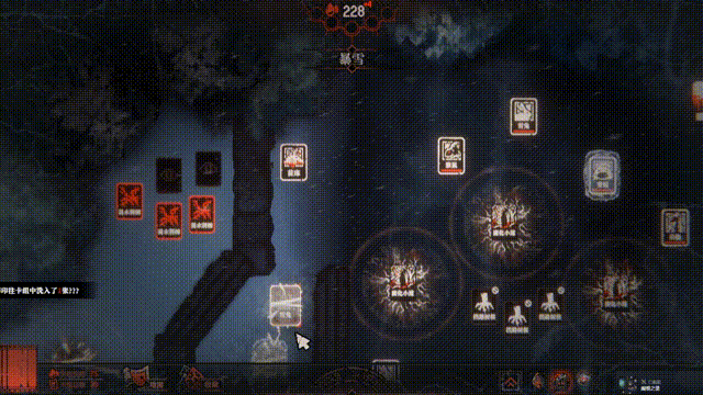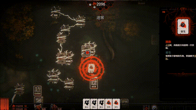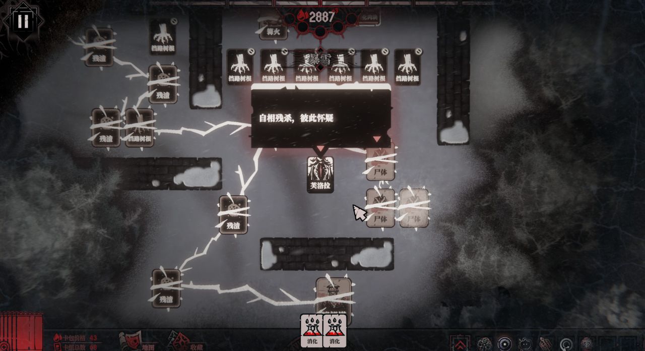 ——因为游戏中的整个地图探索几乎没有任何指引,且在未连接卡牌之前,远处的视野都被一团团黑雾笼罩,你只能抓耳挠腮地拉着根须继续前行,不断用卡牌驱散黑暗,照明一小范围的区域,试图寻找一条畅通无阻的道路。