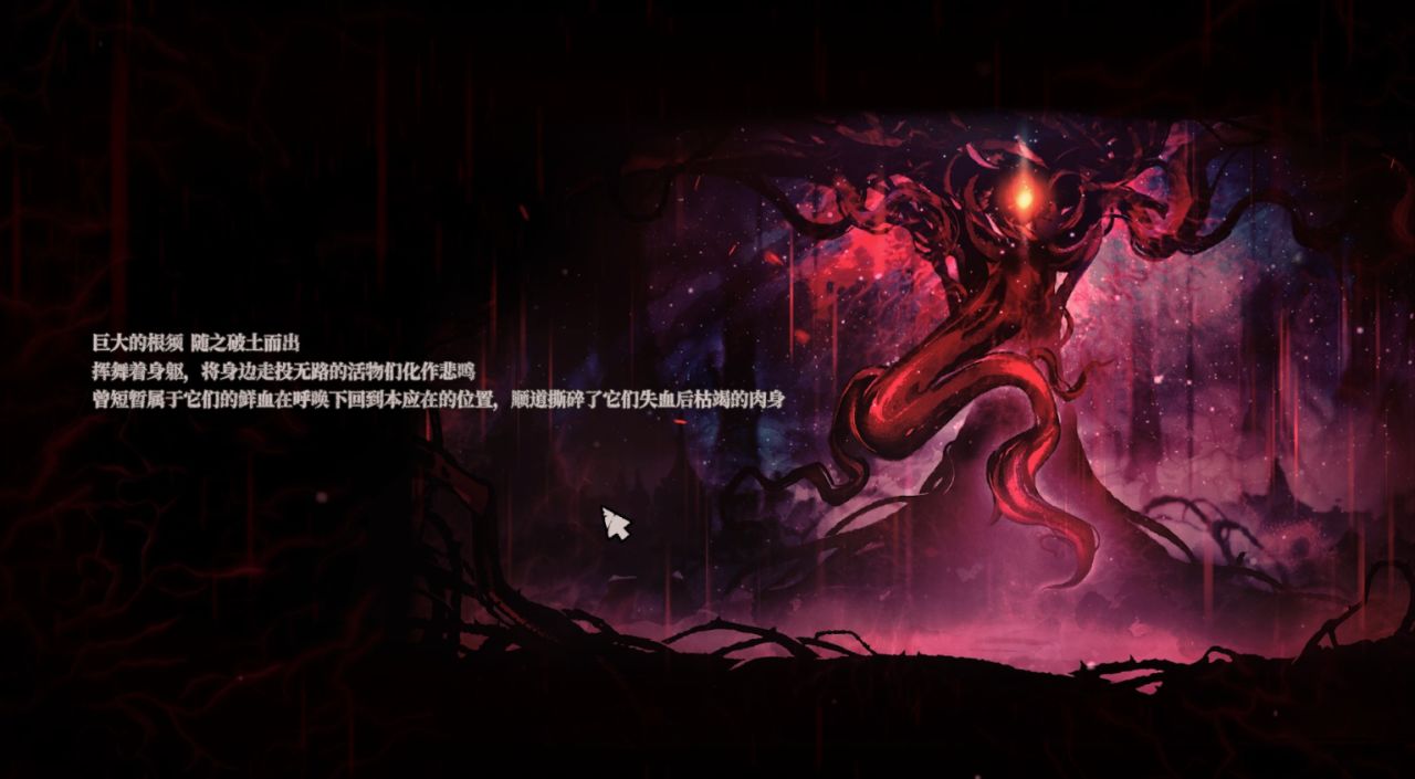 只需用你那根疯狂的根须,刺穿每个生灵的身体,汲取大量鲜血,从森林、沼泽,延伸至雪山,再到城市……直到将光明彻底驱散,将黑暗拼凑完整,便可完成你「融为一体」的使命。