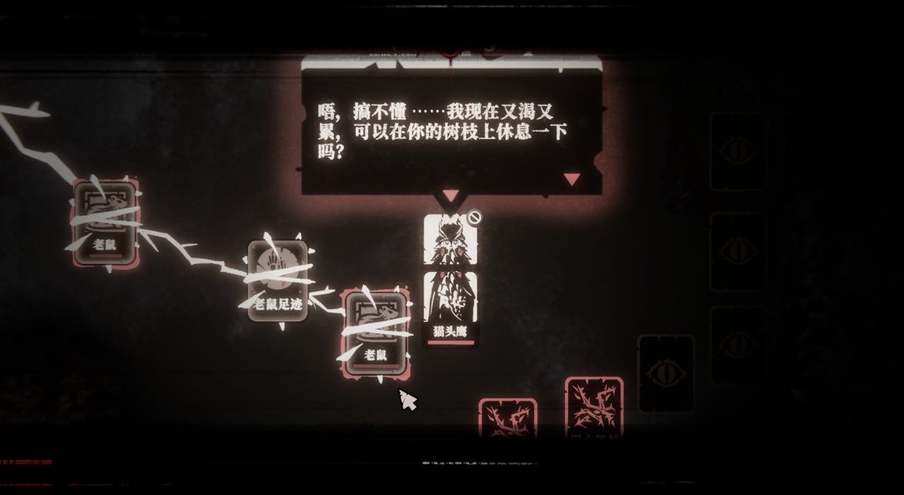 前期在森林中遇见的混合生物「猫头鹰」:若你选择放过她,让这只可爱的猫头鹰载着你的根须去“旅行”,那么她也会成为你的一员。