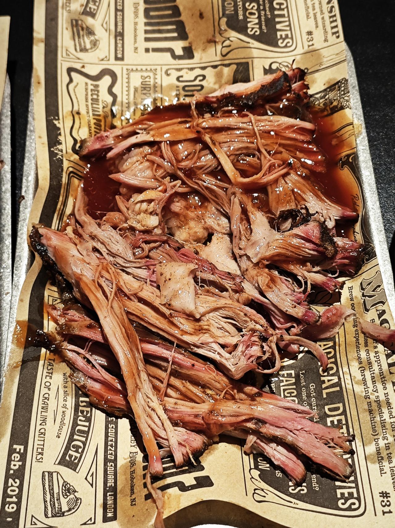 ✨手撕猪梅花,本身猪肉味道很淡,可以说是没有调过味道的,虽然整体的处理和牛前胸类似,但却并没有黑胡椒的苦涩,搭配的酸甜口酱汁应该是加入了苹果汁,使得肥瘦相间的猪梅花肉并不会显得很腻
