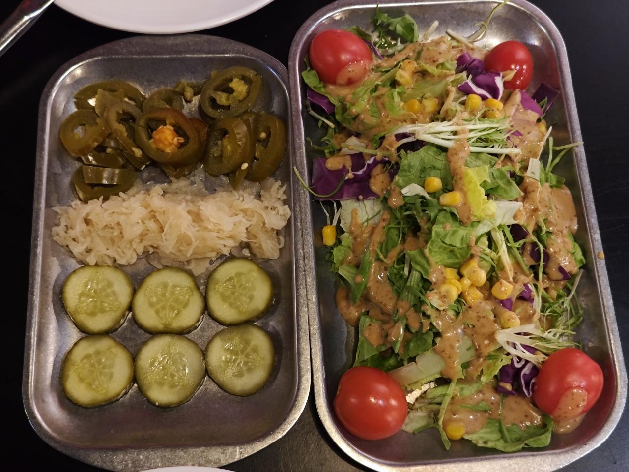 小菜方面和上次大差不差,同样是酸黄瓜,墨西哥辣椒圈和酸椰菜。沙拉也和之前的差不多,就是酱料没有以前给的多了。(花椰菜也算老嘉宾了,后续我会有一期关于德国餐厅的贴子也会提及到,这算是西方常见的解腻菜吧)