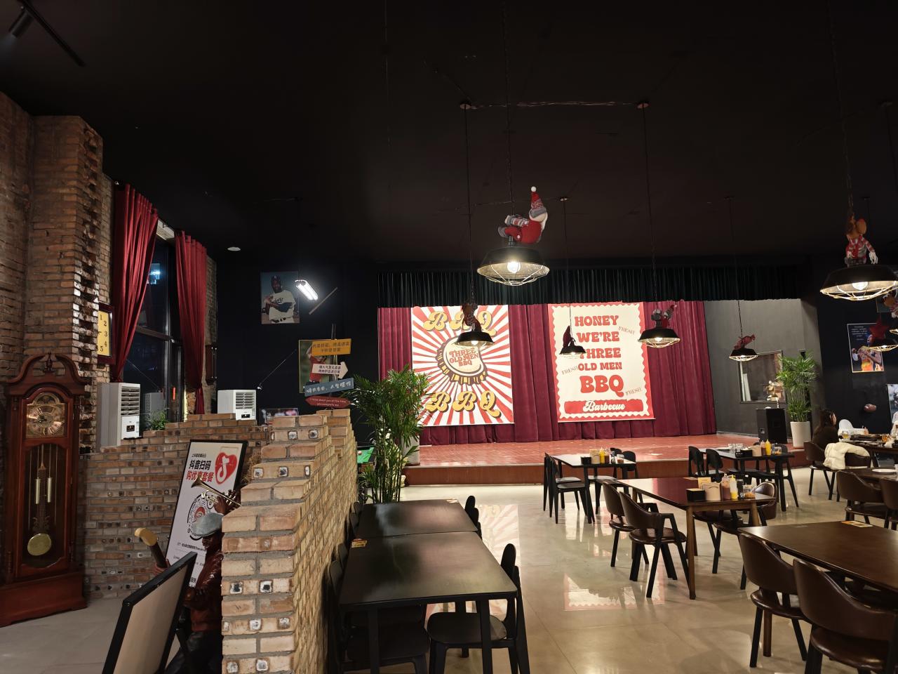 装修和黑炉美式烤肉店的装修风格差不多就是那种工厂风,很粗犷,很美式。中间有个舞台,不排除现阶段或者以后可能会有歌舞表演,因为相关问题,我没有咨询过店内工作人员,所以一切都是我的推测。