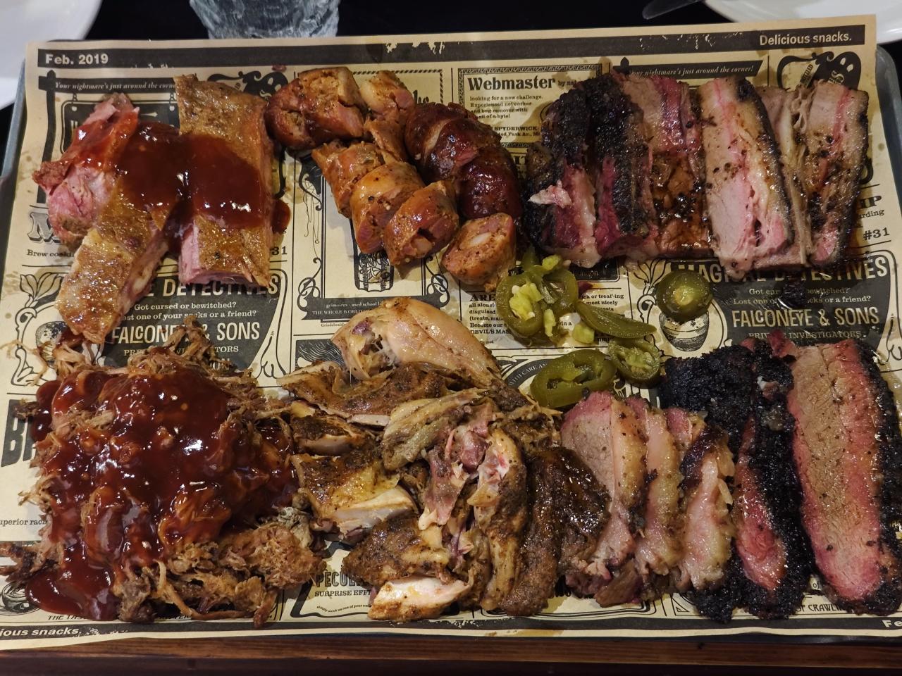 这一次是买了一个套餐,包含有牛前胸(右下)牛后胸(右上)烟熏猪肋排(左上)手撕朱梅花(左下)美式烤鸡(中下)美式烟熏香肠(中上)