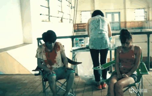 女主一路跑到一個小屋,觀察了自身,發現被咬的地方,其實是拍戲化的妝,頓時鬆了一口氣。