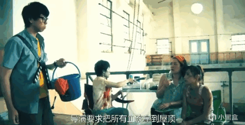 此時助導小哥提着一桶血漿經過,說是導演要求把血漿灑到屋頂。