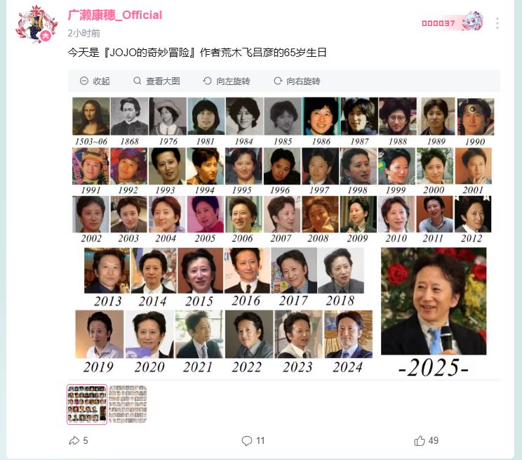以一部連載三十餘年的作品跨越時代,用獨特的畫風、奇絕的設定重塑了戰鬥漫畫的邊界,,因數十年如一日的年輕態被粉絲戲稱爲波紋氣功使用者。