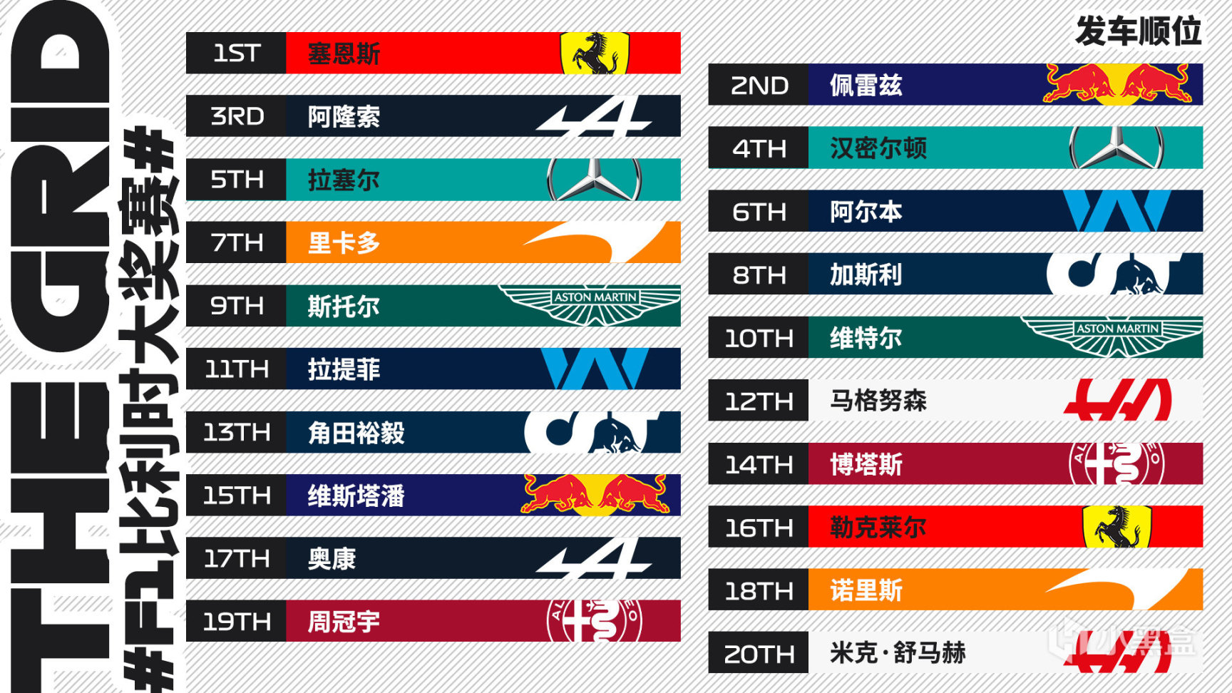 Q2中,阿爾本驚險壓哨衝到第十,本賽季首次晉級Q3,周冠宇、裏卡多、斯托羅爾和米克·舒馬赫被淘汰!Q3,維斯塔潘以1:43.665拿下頭名,但因爲更換動力單元部件超額被罰至隊尾發車,塞恩斯第二,佩雷茲第三,勒克萊爾、奧康、諾里斯也被罰至隊尾,所以阿隆索和漢密爾頓也將上升到第二排發車!(正賽中,角田維修區起步,維斯塔潘上升到P14發車)