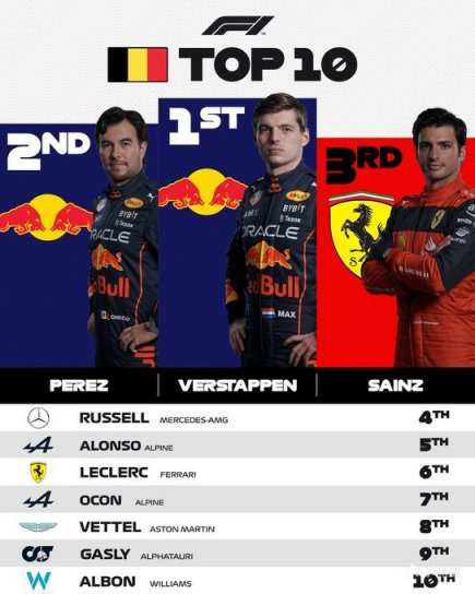 2022年8月28日,F1大獎賽經過漫長的夏休期後,來到比利時的斯帕賽道!本場比賽,維斯塔潘、勒克萊爾因更換動力單元超額罰至隊尾發車,塞恩斯杆位發車!正賽,老漢撞車直接原地起飛退賽,博塔斯也因撞車退賽!維斯塔潘輕鬆從隊尾衝到領跑位置,紅牛一二帶回,而法拉利整場多次更改“Plan”,最後一圈整活讓樂扣進站,維修區超速第五慘變第六!本場過後,我們基本可以提前慶祝維斯塔潘獲得二連WDC!