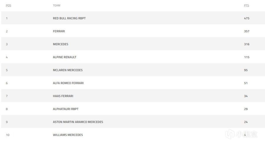 車隊積分榜上,紅牛一二帶回,幾乎拉開與法拉利的差距!梅奔也逐漸把分數追回來,照目前情況來看,下半賽季將聚焦於梅奔對法拉利第二名的衝擊;本場比賽Alpine雙車拿分,排在第四;博塔斯退賽,周冠宇第十四,阿爾法羅密歐暫列第六,目前阿爾法羅密歐將在2023年底結束與索伯的合作,