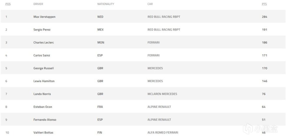 本場比賽,車手積分榜上,維斯塔潘遙遙領先,後面佩雷茲和法拉利、梅奔等五位車手排在第二梯隊,目前來看,維斯塔潘第二個車手總冠軍幾乎沒有懸念,而佩雷茲也憑藉穩定的發揮,反超勒克萊爾來到第二!