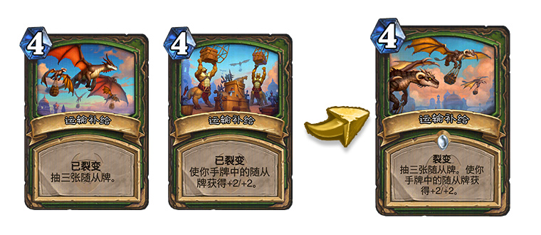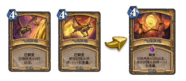 死亡之翼带来的毁灭正席卷艾泽拉斯,而我们的英雄们正竭尽所能收拾残局。全新关键字裂变即将加入与巨龙军团结盟的职业。当你抽到一张带有裂变效果的卡牌时,它会分裂开来,并移动至你手牌的两端。你可以分别使用这些碎片,也可以通过清空中间的其他卡牌使碎片重新交汇,融合为一张更为强大的完整卡牌。