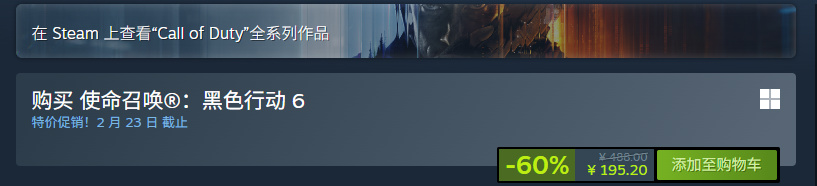 《使命召唤:黑色行动6》迎来 4 折新史低价!标准版售价¥195.2(之前史低 5 折,售价¥244)。