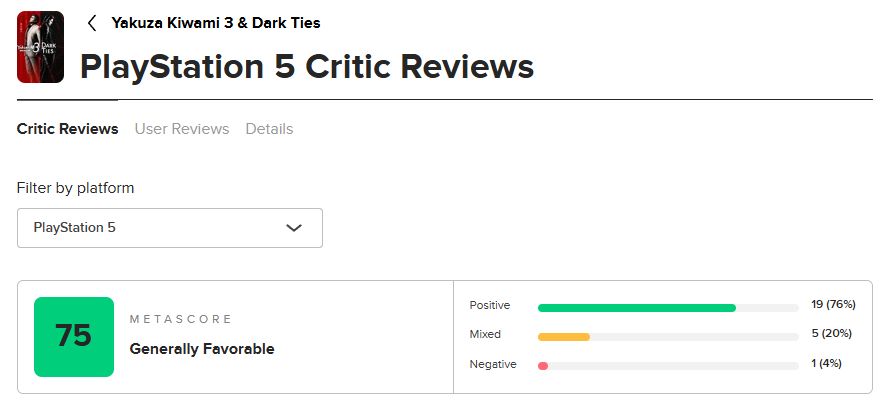 截至发稿前,Metacritic 收录 25 家媒体(PS5),均分 75 分。其中 19 个好评,5个中评,1个差评。