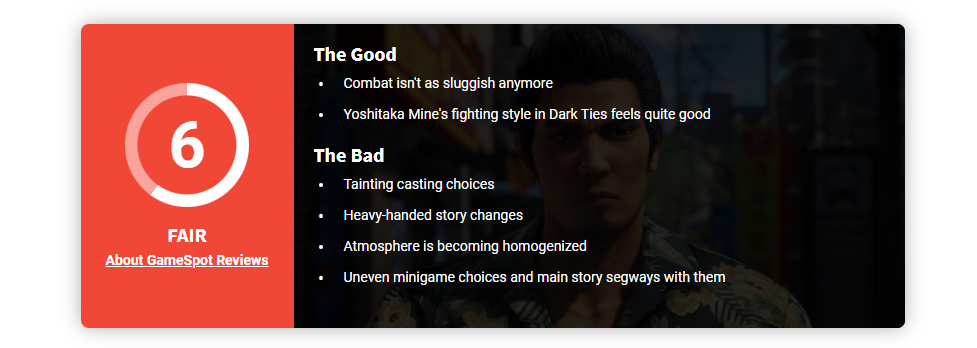 《如龙 极3 / 如龙3 外传 Dark Ties》再次成功融合了硬核剧情与支线荒诞幽默,但作为整体作品,其完成度仍略逊于该系列更出色的前作。