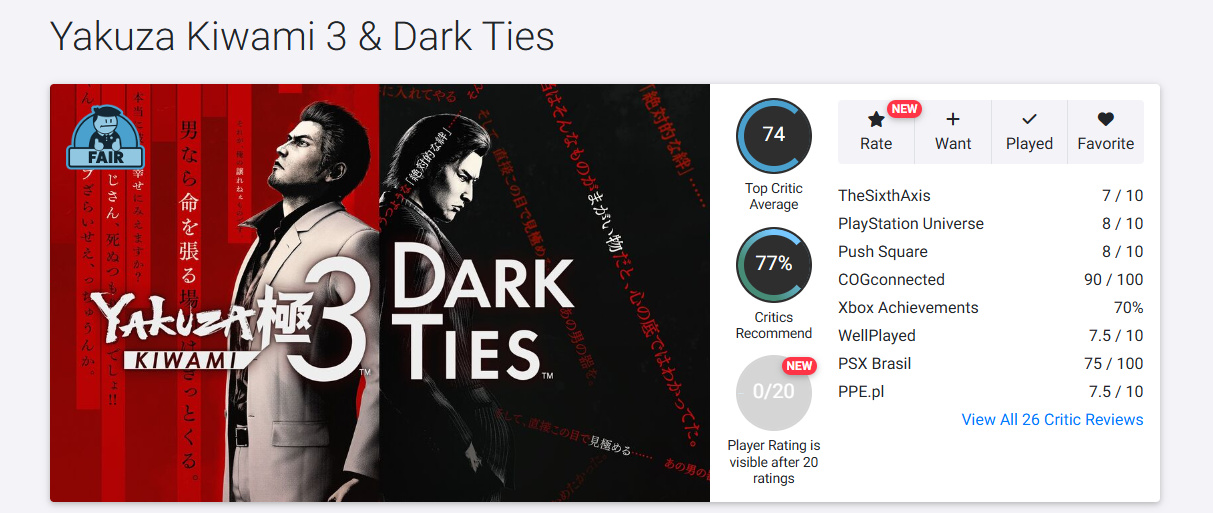 OpenCritic 收录 26 家媒体,均分为 74 分,推荐率 77 %。